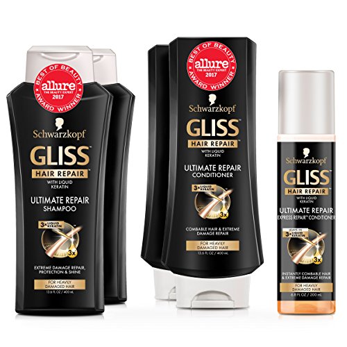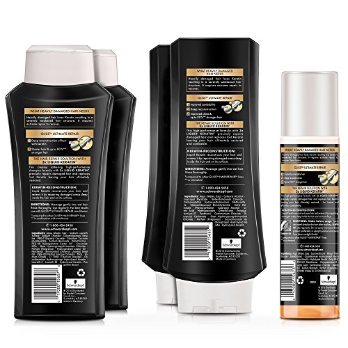 This high-performance formula with 3X liquid keratin precisely repairs damaged hair and replaces lost Keratin leaving your hair restored and comb able. (Compared to other GLISS hair repair lines).