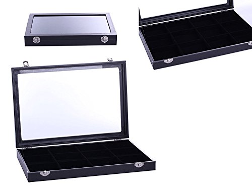 -. Feature : Tray contains 12 compartments / Glass Top Ring display Case keeps your jewelry from dust, keep them secure / Wooden case is coated with a black leatherette. The latch on the lid helps keep you from losing any item / Black velvet compartments. Each compartment size: 3.2x3 Inches, 1" Depth / Case measures: 13 3/4"x9 1/2"x 1 5/8"