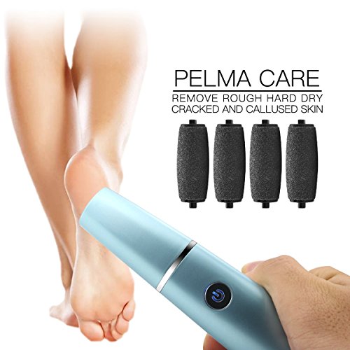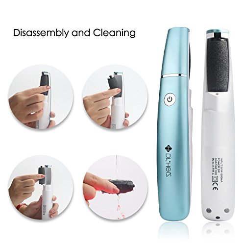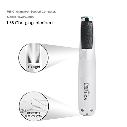 -. Feature : WATER RESISTANT: it has a specifically designed roller head for use on wet and dry feet. But for the best results please use while your feet are "dry" / RECHARGEABLE: You can use your smart phone charger and laptop to charge the tool, saved from replacing battery. charge it about 4 hours for amazing spa like results in your own home / SIMPLE TO USE: The ergonomic handle makes it easy to hold , and the rotating head scrubs dead skin away quickly. / LED LIGHT: a LED light is built in the direction of roller head to illuminate every corner of your feet while removing dead skin. when the light in your home is bad , still can easily use grinding machine. / TWO ROLLER HEADS : The two roller heads contain trace element and mineral , can be cleaned by water. The thick head can effectively get rid of old, thick and hard callus.