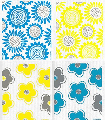 Swedish Dishcloths - (TM) Set of 4 TURQUOISE & YELLOW Sunflowers & Daisy