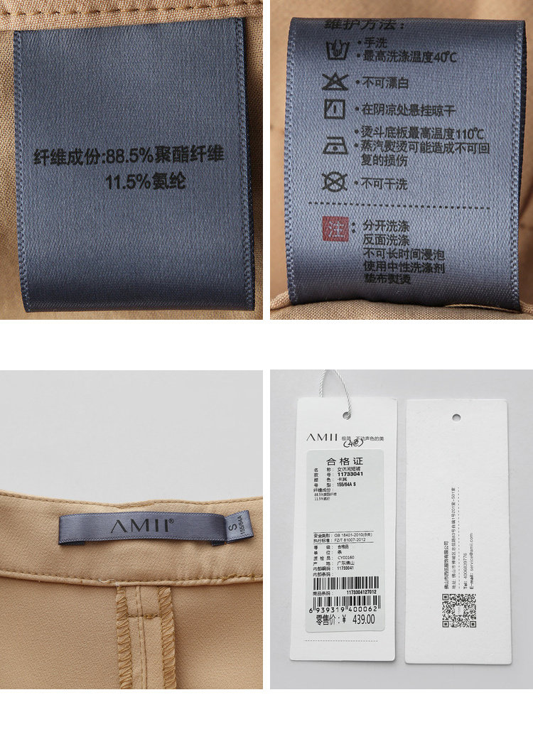 洗涤标准:40℃以下手洗110℃以下垫布熨烫不可浸泡不可漂白不可干洗悬挂晾干