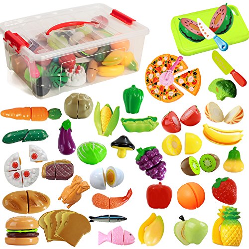 -. Feature : 36 Familiar Cutting Foods,Sliced breads, fish, meats , fruits and much more / Includes 2 Knives, 1 Pizza Cutter and a Cutting Board! Slice up Some Fun! Realistic Cutting Sound as Chidren Slice the Food / Contains full pizza pie for your pretend pizza party fun / Each Pretend Food can be cut in half during play and cooking and then put back together. / Sturdy and Long Lasting Container Included for Easy Cleanup and Storage. School Quality and Safety Tested. BPA Free.