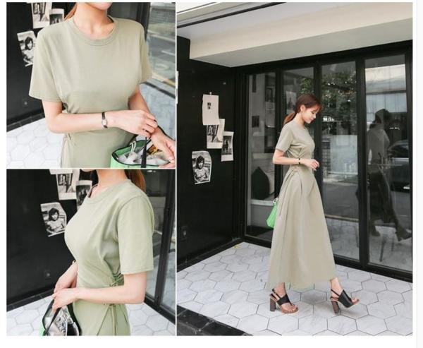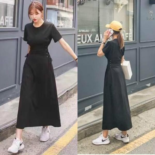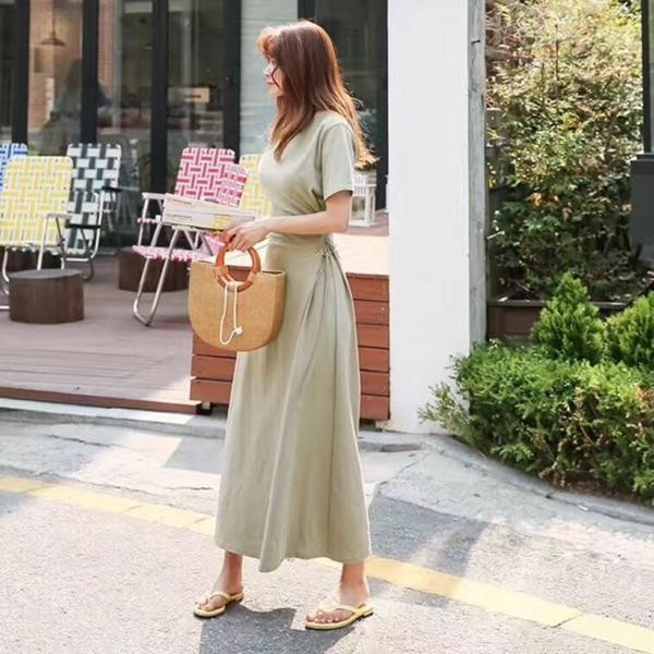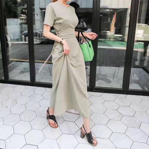 おしゃれ☆サイドコルセット ハイウエスト 半袖 コットンドレス ロングワンピース