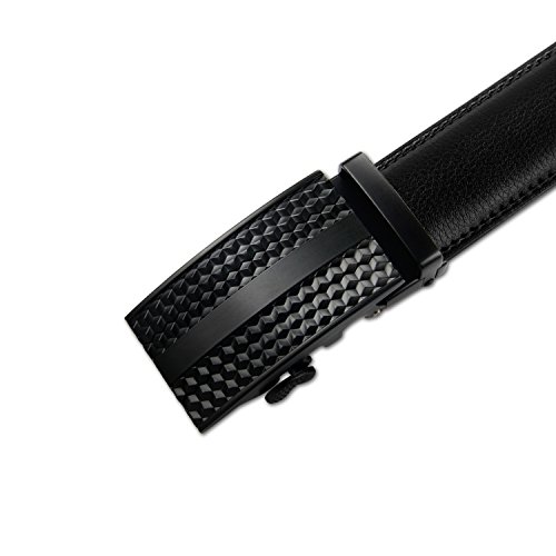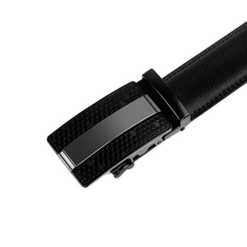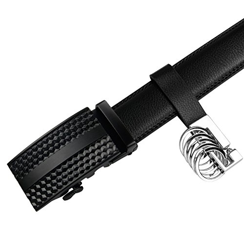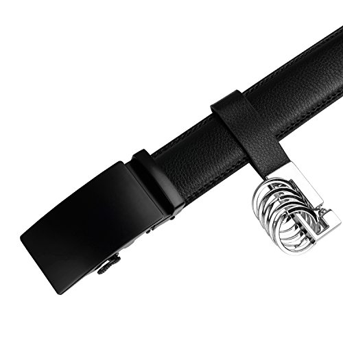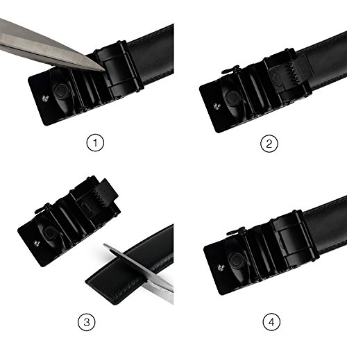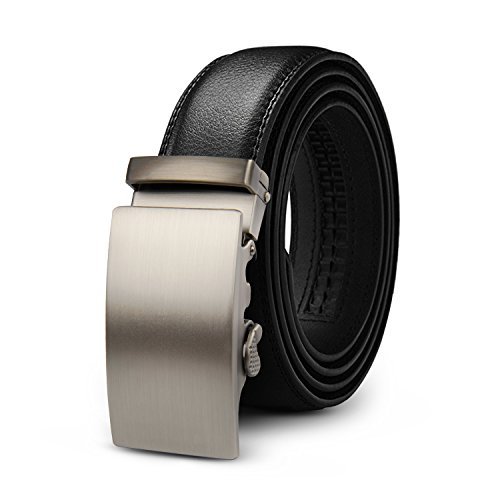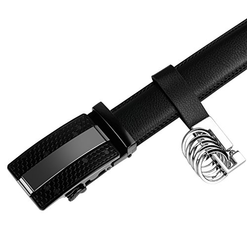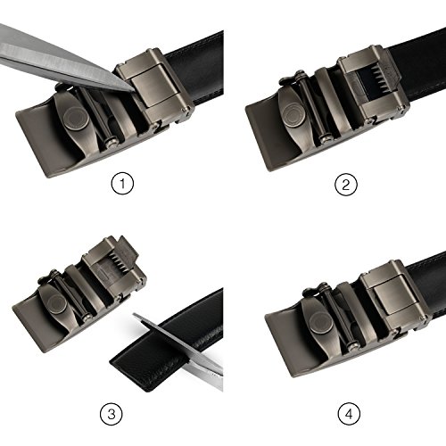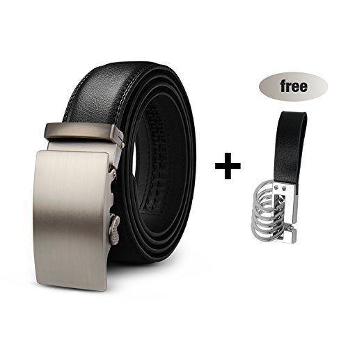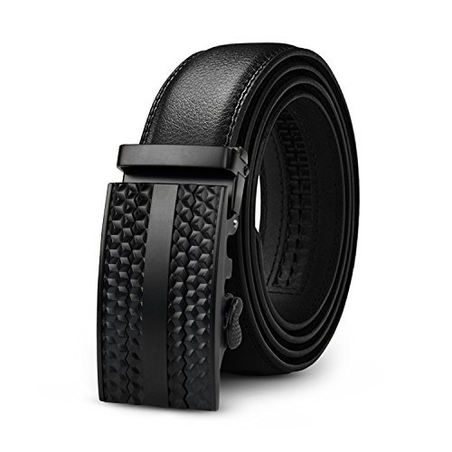 Product Dimension: Width: 1.38 inch (35mm) Length: 50 inch (125cm) Maximum Waistline: 44 inch (112cm) Buckle Material: Zinc Alloy Belt Material: Leather Package Includes: 1x Ratchet Belt with Automatic Buckle , 1X Key Chain This fashionable leather ratchet belt is great gift for businessmen, college students, office staff, teens, outdoor gens, etc.