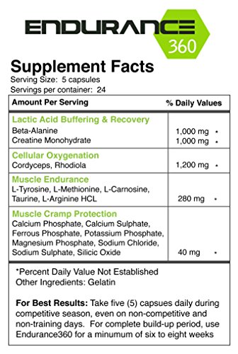 Includes a comprehensive list of muscle strengthening amino acids (beta-alanine, creatine, tyrosine, methionine, carnosine, taurine, arginine). Endurance360®® also includes oxygenating rhodiola, cordyceps, and muscle cramp protecting electrolyte minerals.