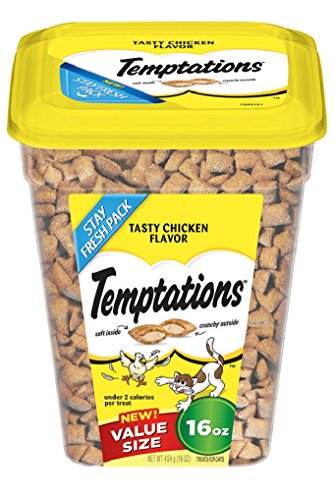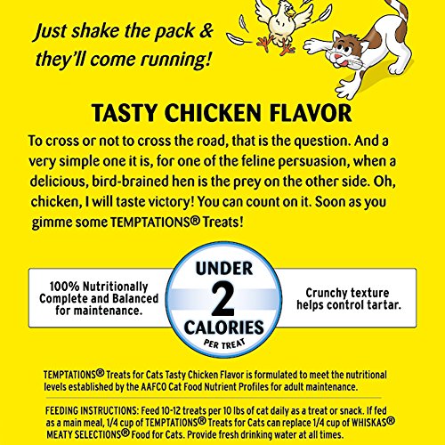Pet parents know texture is just as important as taste for their cat. TEMPTATIONS Treats for Cats Tasty Chicken Flavor features a unique pocket shape that is delightfully crunchy on the outside and scrumptiously soft and creamy on the inside. Your feline friend will adore the natural, mouth-watering poultry taste, which never contains artificial flavors. America's #1 cat treat* also is 100% nutritionally complete and balanced for adult cat maintenance. You will love that your cat is getting great-tasting nutrition, and at only 2 calories per treat, our delicious cat treats are perfect for playtime, snack time or anytime. (*Based on sales data)Feature