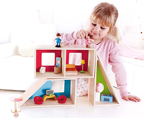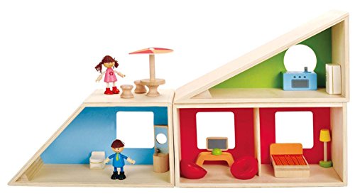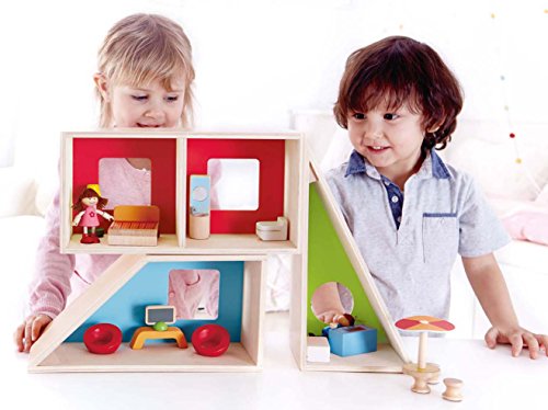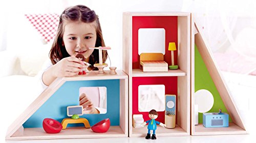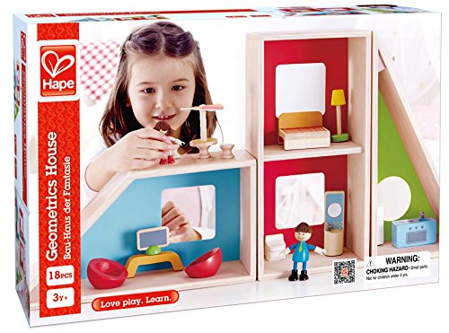 A future architect's dream! The Geometrics Doll House from Hape provides a unique and creative alternative to the traditional doll house. A triangle, divided rectangle, and a polygon make up the modular rooms of this house, and can be rearranged over and over again for a different design every time. Line them up side by side or stack them up high, the possibilites are as endless as the hours of entertainment children will have building their dolls' new home. Includes stylish furniture to decorate the interior, and a doll family excited to move in. Encourage your child to create stories and adventures for their dolls, developing imaginative thinking and storytelling skills. Made with wood sourced from environmentally sustainable forests. Durable child safe paint finish and solid wood construction make this a toy your child will love for years to come. Hape toys stimulate children through every stage of development and help nurture and develop their natural abilities. All Hape products sold in North America meet or exceed all applicable safety standards. The Geometrics Doll House is the 2015 Today's Parent Toy Guide Winner and a 2015 Family Fun Toy Fair Favorite, as well as a proud recipient of the 2015 Oppenheim Toy Portfolio Platinum Seal Award.Feature