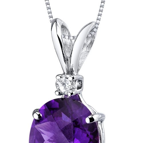 Gemstone: Genuine Amethyst, Oval Cut, 10 x 8 mm, 2.06 carats, Royal Purple Hue with Brilliant Sparkle. 0.05 carat genuine Diamond with G-H color and SI1-SI2 clarity. Pendant: 0.94 grams pure 14k White Gold with 14k stamp. Pendant feature exceptional Design, Craftsmanship and finishing. Perfect gift for Mothers Day, Birthdays, Valentines Day, Graduation, Christmas or just about any other occasion. Money Back Guarantee. Includes a Signature Gift Box. Includes matching 18 inch Sterling Silver Rhodium Finish Box Style Chain. Style P8922Feature