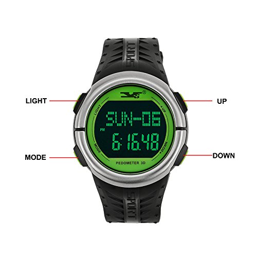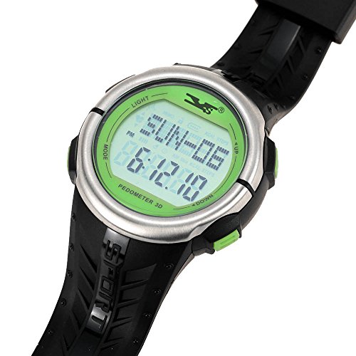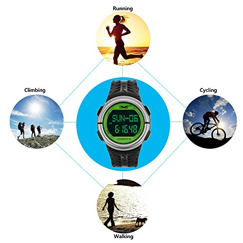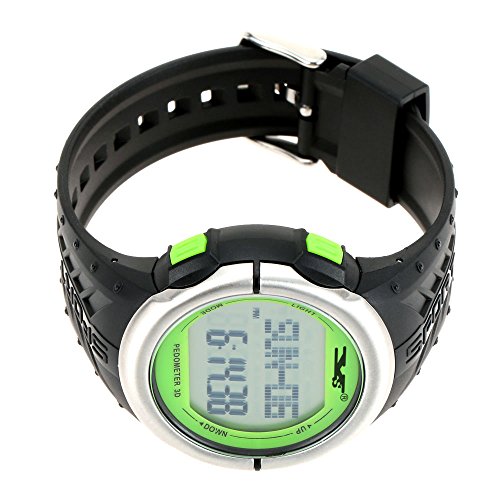 -. Feature : Normal Time: Hour, Minutes, Second, Day and Weekday; 12/24 hr format; Calendar (Yr 2000-2099). 2-set alarm: Daily alarm & hourly chime. / Chronograph ranging from 0 to 59:59:99, with SPL function. Countdown function, up to 23 hr 59 min. / Pedometer function: 7 second smart detection. Three pedometer mode: Total steps / time display mode→ Total steps / exercise time display mode→ calories / mileage display mode. User information settings: Metric / imperial→ weight→ G-Sensor sensitivity. Notice: Most accurate pedometer range, 80~130 steps/minute. / 50-day automatic step storage function. / Heart rate mode: Touch-on pulse measuring, showing dynamic heart rate ranging from 30 to 200. 4 seconds EL backlight.
