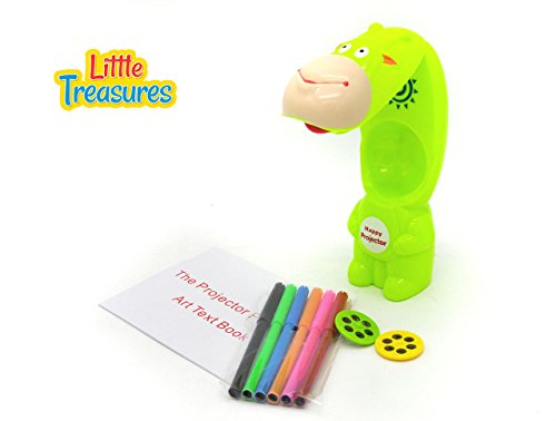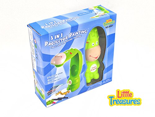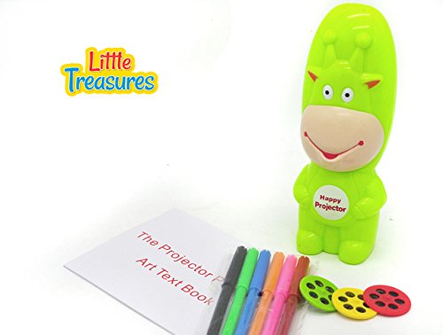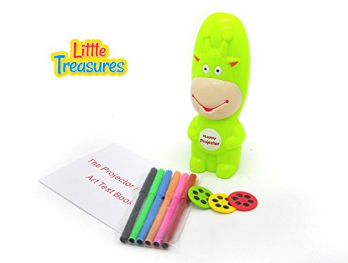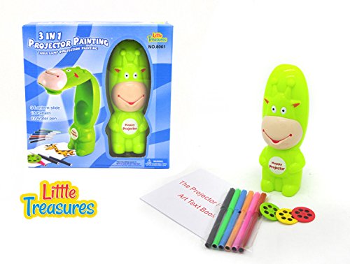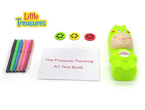 Studio : Little Treasures Publisher : Little Treasures Binding : Toy Product Description The little treasures table lamp projection painting kit, is great for any small artist. It is great for anyone who loves to draw or write. It projects the patterns that are on the lantern slides and projects a larger picture onto paper. Where you can trace, color, draw and more! it can provide hours of fun. It is small enough to take anywhere with you too. So it makes it great for when your camping, sleeping over at a friend's, visiting relatives and more. The best thing is it comes with 3 lantern slides to get you started! there are 3 lantern slides included in the little treasures table lamp projection painting kit. Each lantern slide has 6 different designs. You also get 6 colored water color pens too. As well as an art text book to go with it. The projector is made of a durable high quality plastic, which is great if you plan on taking it places. It folds open when you want to use the projector feature. It is neon green too, which makes it easier to spot in an area with a lot of stuff. There are some small pieces so not recommended for real young children that may put pieces in their mouth. 0