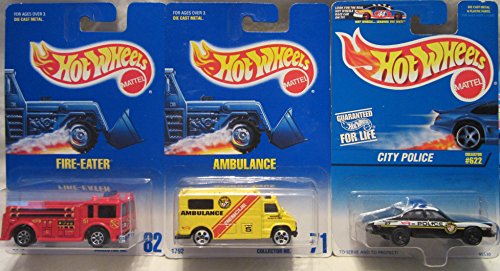 -. Title : Hot Wheels Fire Truck Fire-Eater #82, Ambulance #71 & City Police #622 Die Cast 1/64 Scale 3 Car Bundle!