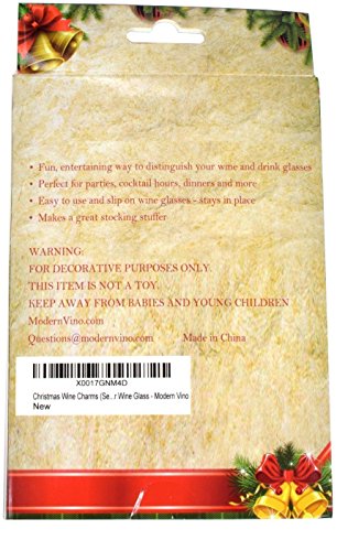 -. Binding : Health and Beauty -. Brand : Modern Vino -. Color : White -. EAN : 0718194975126 -. Feature : Perfect Gift for Christmas! Great for Holiday Parties! Perfect to Identify your Wine Glass / Elegant and Fun way to Distinguish your Wine and Drink Glasses! / Easy to open clasp! Most wine charm clasps hurt your fingers, but ours are super easy to open and close! / Set of 6 Metal Wine Charms -. Label : Modern Vino -. Manufacturer : Modern Vino -. Model : No Model -. MPN : No MPN -. PackageQuantity : 5 -. PartNumber : No MPN -. ProductGroup : Kitchen -. ProductTypeName : KITCHEN -. Publisher : Modern Vino -. Studio : Modern Vino -. Title : Christmas Wine Charms (Set of 6) - Great for Holiday Parties, Perfect to Identify your Wine Glass - Modern Vino -. UPC : 718194975126