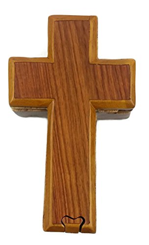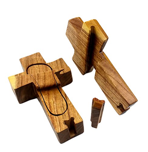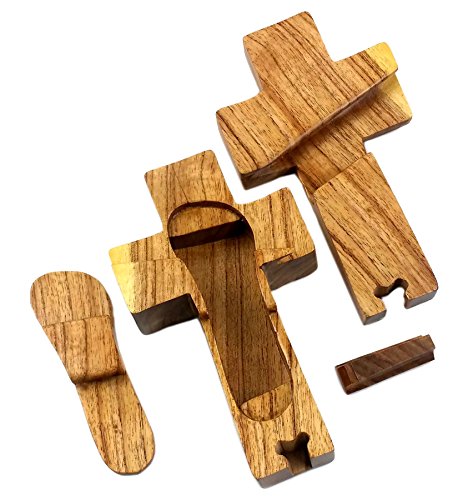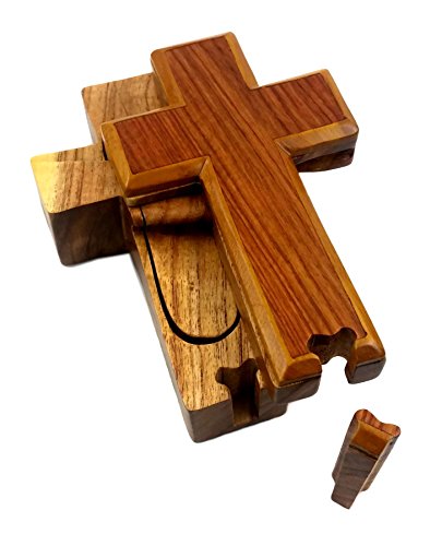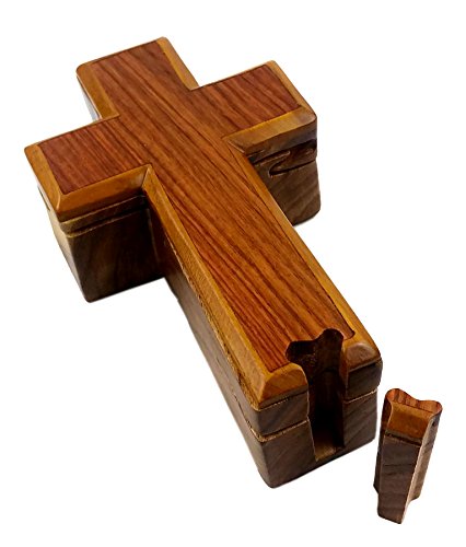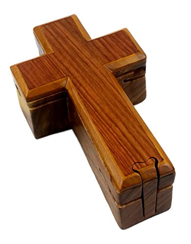 "Holy Cross" All Natural Exotic Woods Puzzle Box, 6.25 X 3.75 X 2" with Sliding Wooden Key Lock, Sliding Cover and Inner Lid to Hidden Compartment. Hand-made Wood Onlay Design on Lid.