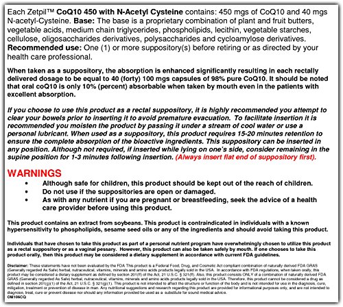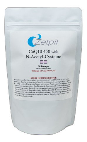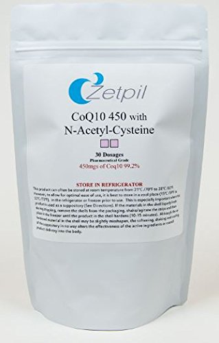 Studio : Zetpil Publisher : Zetpil Binding : Health and Beauty Product Description Each ZetpilTM CoQ10 450 with N-Acetyl Cysteine contains 450 mgs of CoQ10 and 40 mgs N-acetyl-Cysteine. Base: The base is a proprietary combination of plant and fruit butters, vegetable acids, medium chain triglycerides, phospholipids, lecithin, vegetable starches, cellulose, oligosaccharides derivatives, polysaccharides and cycloamylose derivatives. 0