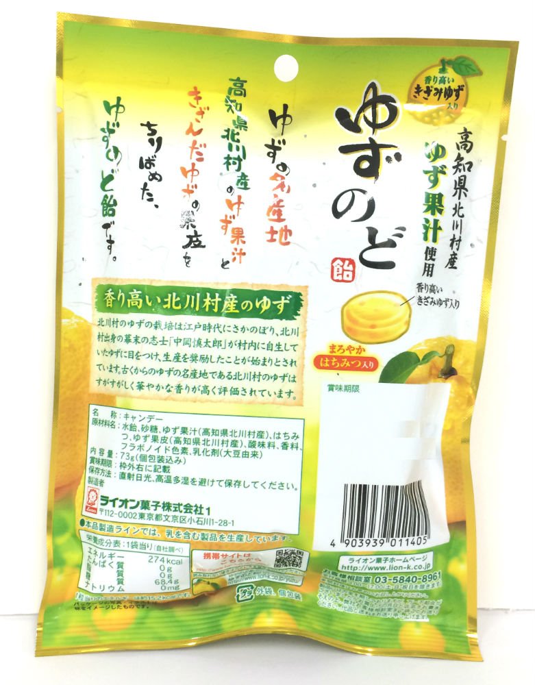It is a fragrant throat candy fragrant with Yuzu juice and chopped Yuzu produced by Kitagawa village from Kochi prefecture.