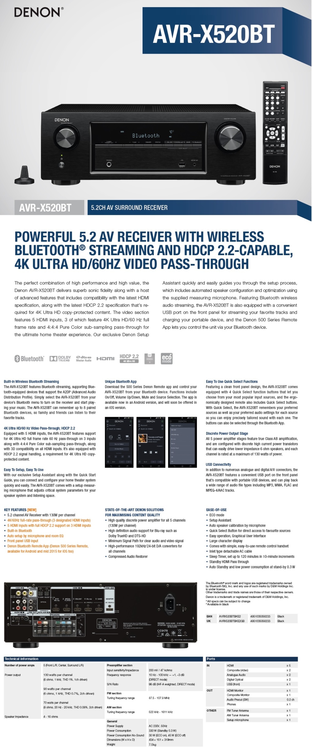 Product details of DENON AVR-X520BT 5.2CH AV RECEIVERS