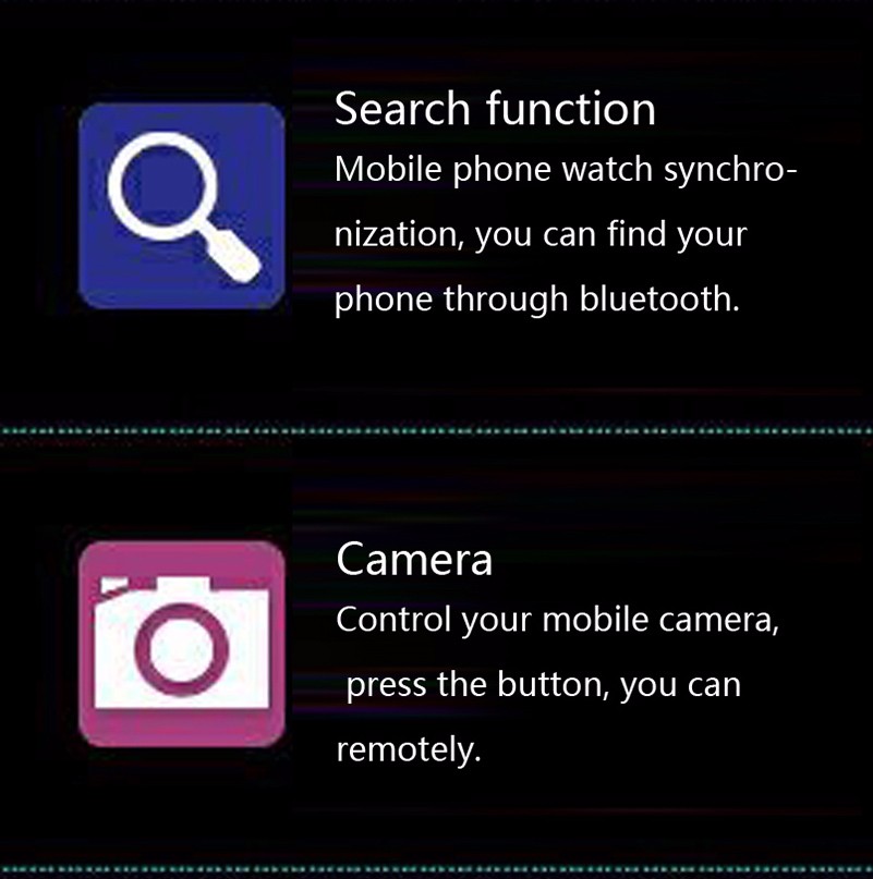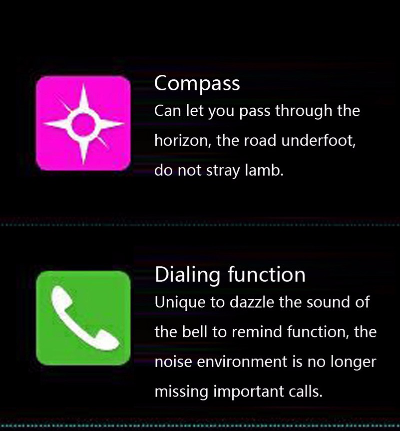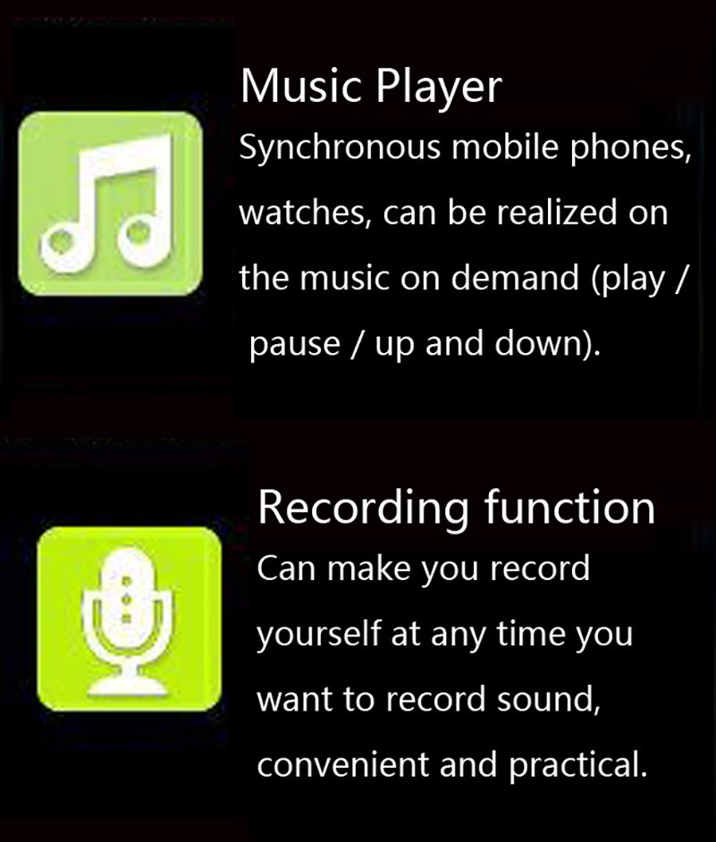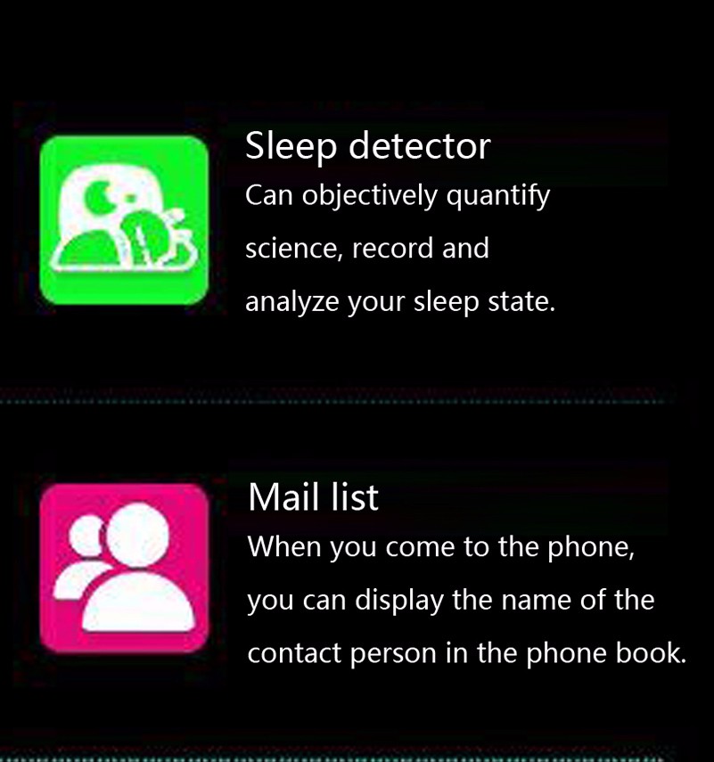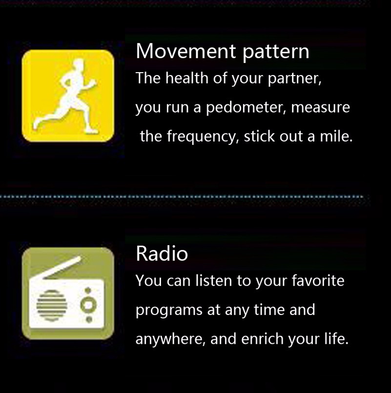 • Time/Alarm clock/Calculator/Calendar/Stopwatch/MP3/Sleep Monitor/Wap/FM Radio/Recording/Camera/Video