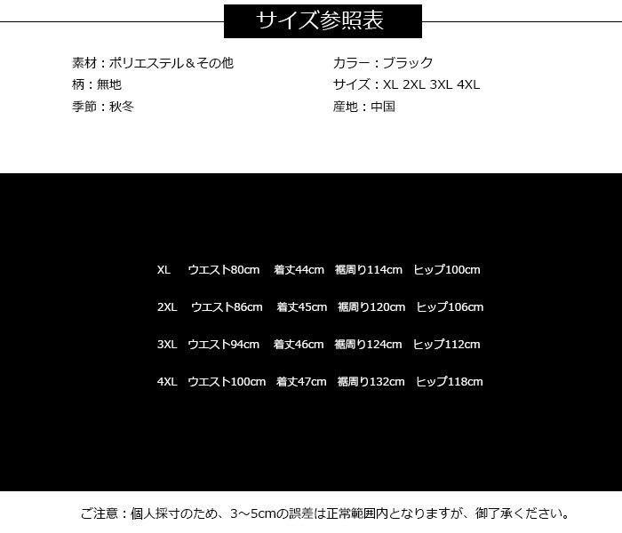 スカート 秋 レディース ハイウエスト スカート ショート丈 タイトスカート OL 通勤 オフィス2018秋冬新作 スカート 秋冬 レディース フレアスカート 膝丈商品詳細素材:ポリエステル&その他柄:無地季節:秋冬カラー:ブラックサイズ:XL 2XL 3XL 4XL産地:中国サイズ参照表XL ウエスト80cm 着丈44cm 裾周り114cm ヒップ100cm2XL ウエスト86cm 着丈45cm 裾周り120cm ヒップ106cm3XL ウエスト94cm 着丈46cm 裾周り124cm ヒップ112cm4XL ウエスト100cm 着丈47cm 裾周り132cm ヒップ118cmご注意:個人採寸のため、3~5cmの誤差は正常範囲内となりますが、ご了承ください。スカート 秋 レディース ハイウエスト スカート ショート丈 タイトスカート OL 通勤 オフィス2018秋冬新作 スカート 秋冬 レディース フレアスカート 膝丈