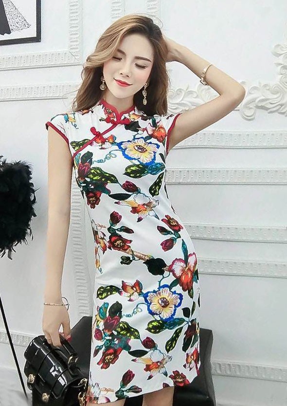商品名□花柄スタンドカラースリット入半袖チャイナドレス全4色FYQ80978#e543e546【予約販売12月下旬より順次発送予定】 【送料無料】チャイナドレス パーティードレス 花柄 スタンドカラー スリット入 半袖