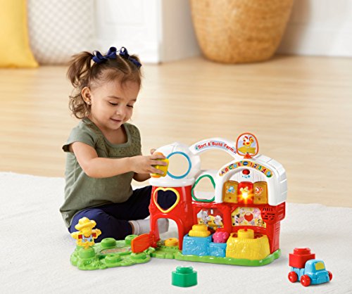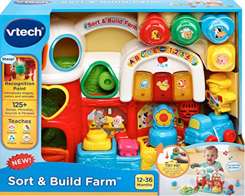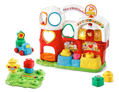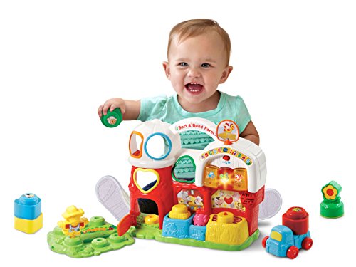 It's learning and sorting fun down on the farm with the sort & build farm by VTech. The playset includes five brightly colored shape blocks for building, stacking, sorting and learning. Insert one of the four animal shape blocks into the smart block recognition slot to hear the animal name, color and shape, or insert the flower block to hear fun phrases. Press the three light-up buttons to learn about how the rooster, tractor and watering can help out on the farm. The non-electronic shape sorter helps build motor skills and hand-eye coordination. Features two modes of play, a learning mode and a discovery mode that encourages imaginative play. .Feature