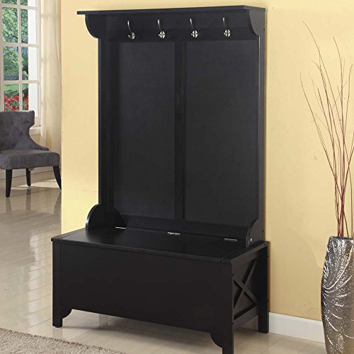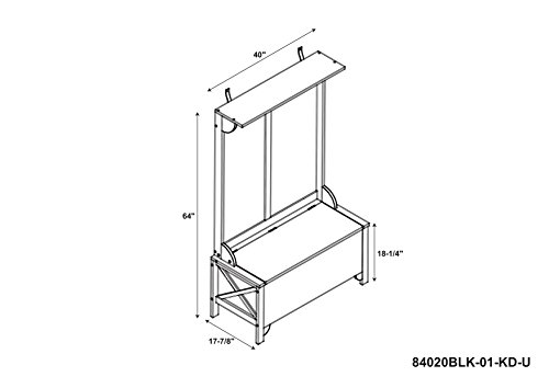 -. Feature : Bench seat lifts revealing convenient, hidden storage / Constructed of durable pine and engineered wood / 4 double hooks provide ample areas to hang coats / Sleek, distresed antique black finish with red rub thru / Dimensions: 40W x 18D x 64H inches