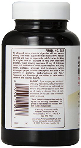AH Super Papaya Enzyme Plus 90 Chewable Tablets. An advanced, more powerful digestive aid "after-meal" supplement contains 100% natural enzymes and may be especially helpful when looking for a higher level of support to help with inefficient digestion. Each serving contains 15 mg of delicious papaya fruit fortified with well-known enzymes, including papain, protease, amylase and bromelain, which encourages proper nutrient absorption and aids in the digestion of proteins, carbohydrates and fats. Peppermint and Chlorophyll are added to help reduce bad taste and sweeten breath.
