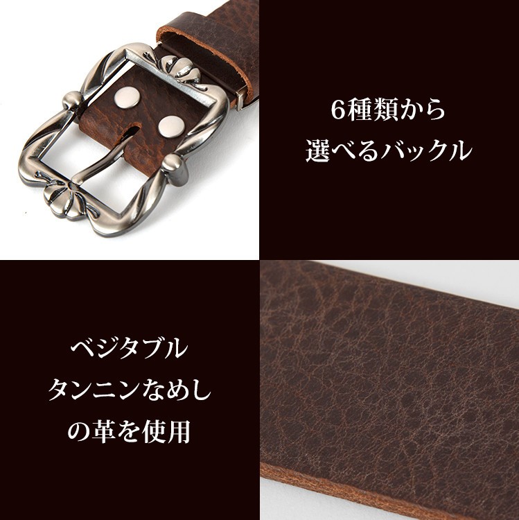 肉厚のある重厚でしっとりとした質感のレザーを使用してます。6種類のバックルから選びいただけます!カラーも、ブラウン・ヌメ革・ブラックの3種類!コンチュリア800のレザーを使用しております。ベジタブルタンニン鞣し(Concia in fossa)という環境にやさしい昔ながらの伝統ある方法で鞣されています。【素材】ベルト:牛革  バックル:合金【サイズ】ベルト:長さ118cm 幅3.8cm 厚み:0.4cm 【仕様】ベルト穴5穴(1.8cm間隔)    ※長さ調節できます。