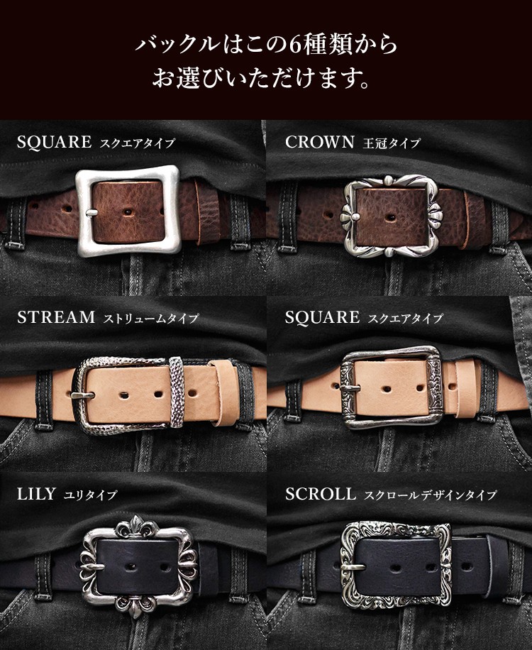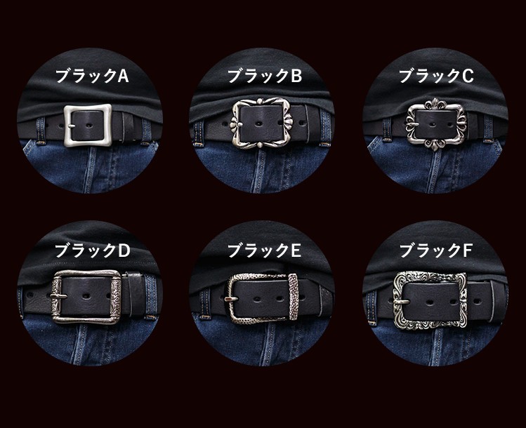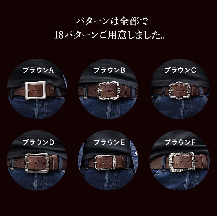 カラーは、人気のブラック・ブラウン・ヌメ革の3色からお選びいただけます。バックルのパターンは6種類ご用意しました!18パターンのなかから、あなたにピッタリのベルトを見つけてください。