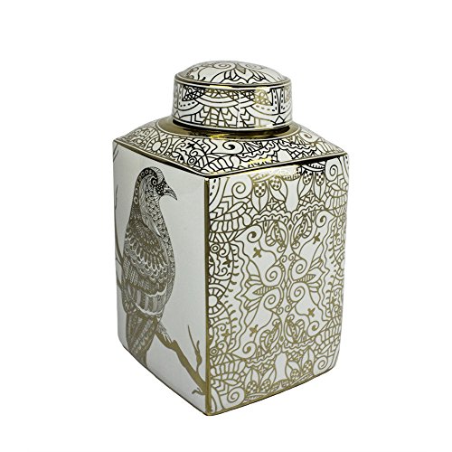 Benzara Beautiful Ceramic with Hawk Motif Covered Jar, White/Gold