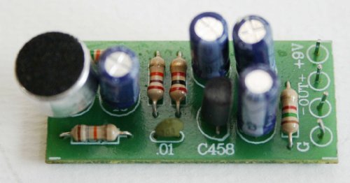 -. Feature : The board is a small circuit with an on-board condenser mic and preamp. This microphone-condenser pre-amplifier circuit.This circuit is small and has only few components.This circuit has pre-mic and mic-condenser, it is high sensitivity than normal circuit. / Requires 9 VDC , Current Consumption : 5mA.max / PCB size : 0.67 x 1.50 inches / Comes with the schematic diagram / It has higher sensitivity than normal circuits
