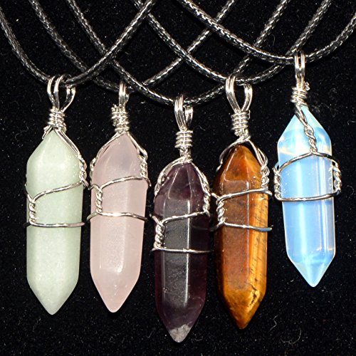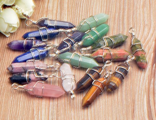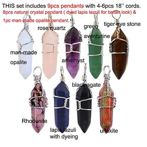 (8pcs NATURAL crystal pendant and 1pc man-made opalite pendant. The lapis lazuli is made of natural material with dyeing for better look) Pendant Size: appr 39*9 mm, Cord Chain Necklace: 18 inches