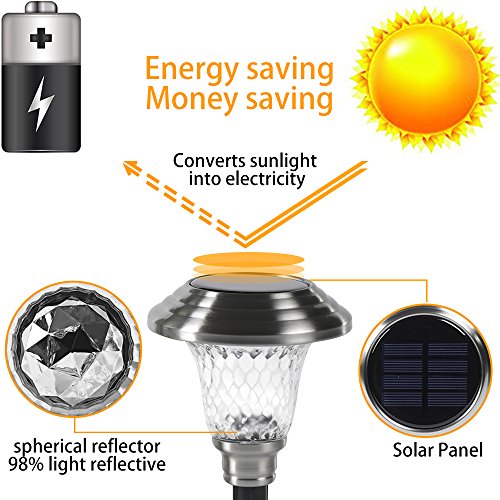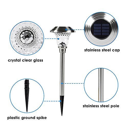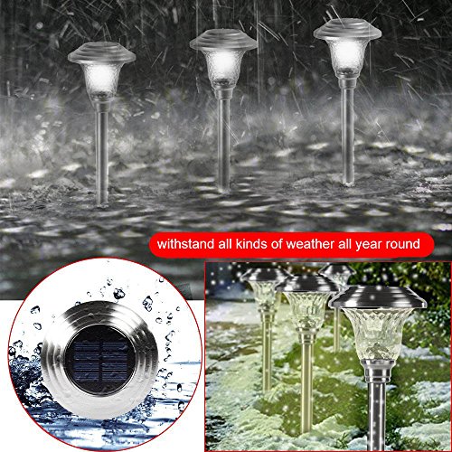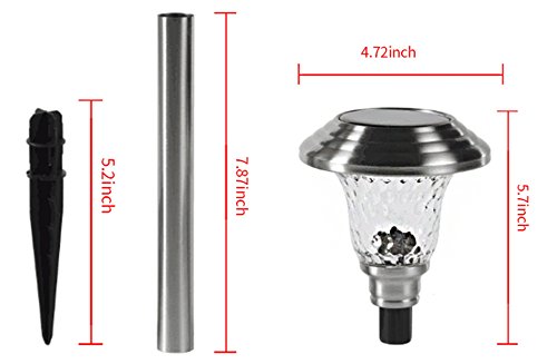 SIZE & RUSTPROOF GLASS / STAINLESS STEEL: Solar path light measures 16.54" in height x 4.72" in diameter. Solar Pathway Light made of stainless steel with watertight diamond glass lightshade that enables you to use the bright solar lights outdoors durably. Metal quality of this solar powered walkway light is much better than plastic.