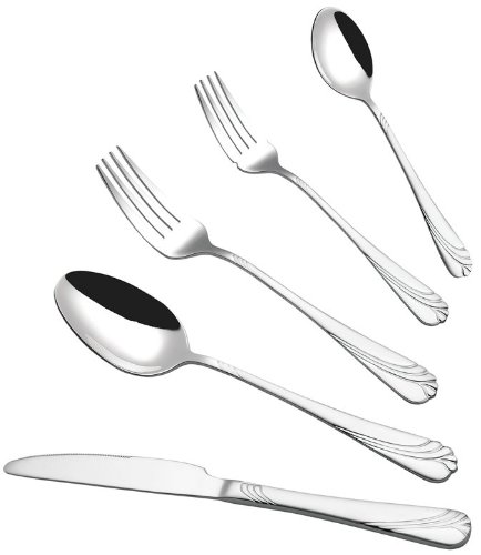 - 20-piece set includes service for 4 of each of the following: dinner knife, dinner fork, soup spoon, salad/dessert fork, and teaspoon