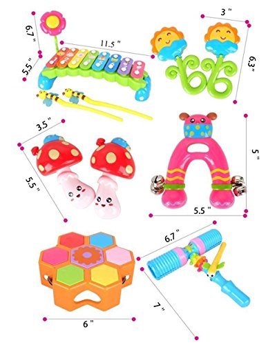 -. Feature : Package Dimension: 24.5" x 3.5" x 16"-L x W x H. Made of ABS plastic, Non-toxic, durable and high quality. Able to sound, spin, grip and shake, attract the baby's attention, and promote toddlers hand eye coordination. / A complete 10pcs rhythm instrument kit includs 6 different instruments: 1 x Rainbow Xylophone(with 2 hammers), 1 x Caterpillar rattle, 1 x Cellular tambourine, 1 x Butterfly Ring tube(with 1 hammer), 2 x Sunflower Castanet, 2 x Mushroom Sand hammer. / Able to sound, spin, grip and shake, attract the baby's attention, and promote toddlers hand eye coordination. Bright colors help baby's perception of color and make the brain develop faster. The instrument sound can help the toddlers to distinguish the voice and recognition direction. / Perfect size instruments for preschool and early elementary children in group or individual play. / Great toy gift for preschool kids, children, toddler and newborn baby. Suitable for 12 months to 6 years old.