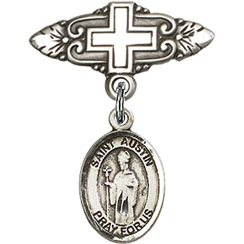 -. Title : Sterling Silver Baby Badge with St. Austin Charm and Badge Pin with Cross 1 X 3/4 inches