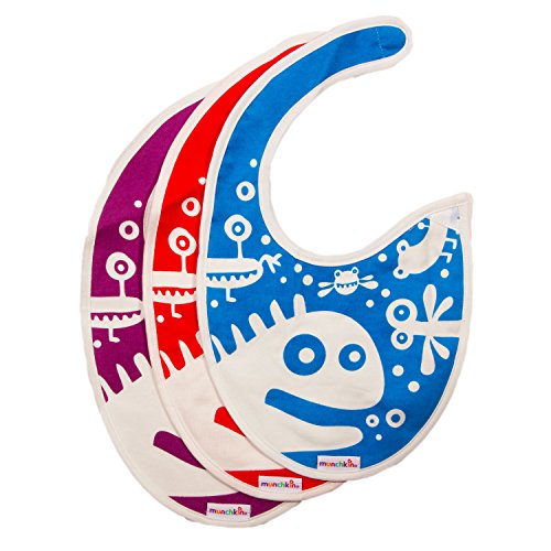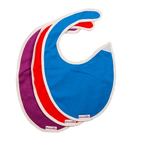 Munchkin baby bibs for boys and girls are made from 100% cotton. These resusable bibs are machine washable and free of chemicals and pollutants. Bibs have velcro closure.