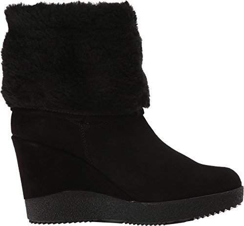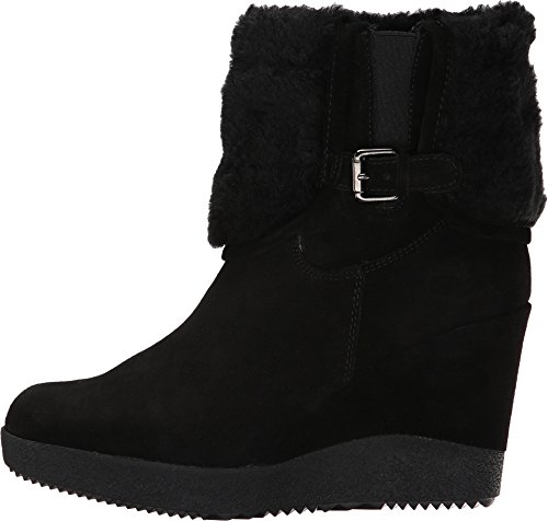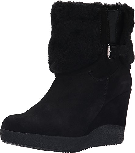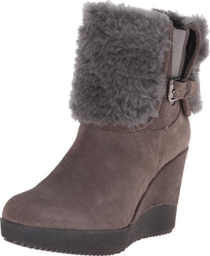 Suede leather upper boasts a faux fur collar. Pull-on construction. Elastic goring at side with an adjustable buckle. Textile lining. Padded synthetic footbed. Covered wedge heel. Rubber outsole. Imported.