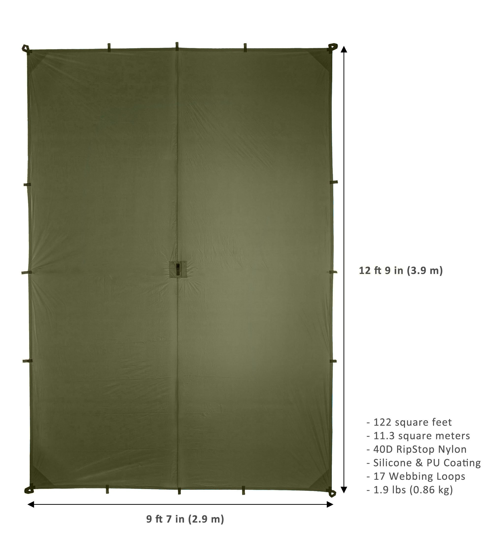 It is possible to install it at various angles using a reinforced webbing loop located on the periphery and ridgeline of the tarp.