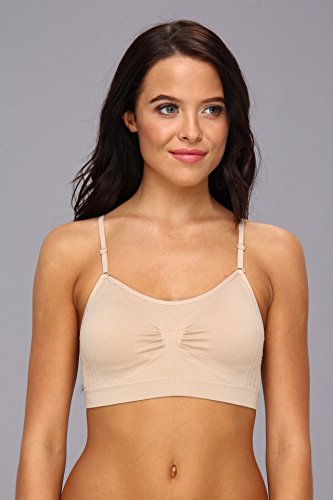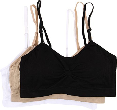 Fits 32A through 36D. Three per pack. Scoop neckline. Wireless construction. Subtly ruched ribbed inset at center bust for shape. Removable contour pads for modesty. Ribbed underbust band. Adjustable shoulder straps are convertible to crisscross or regular. Slips on over head. Style #9012. 88% nylon, 12% spandex. Machine wash cold, line dry. Imported. If you're not fully satisfied with your purchase, you are welcome to return any unworn and unwashed items with tags intact and original packaging included.