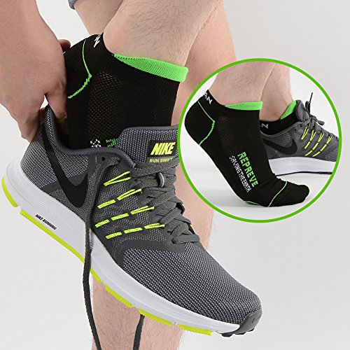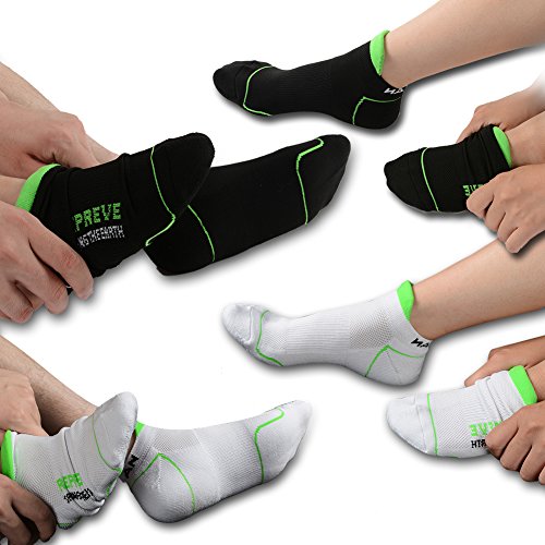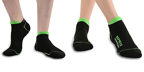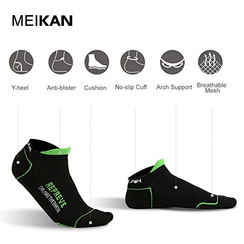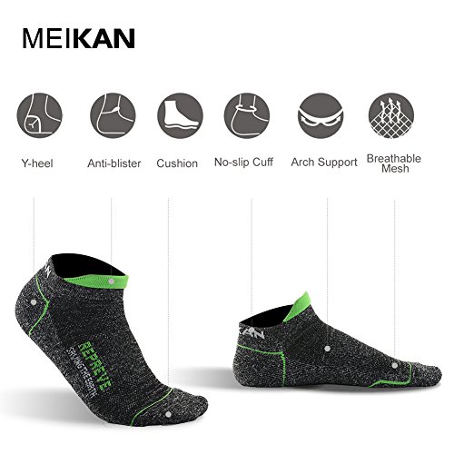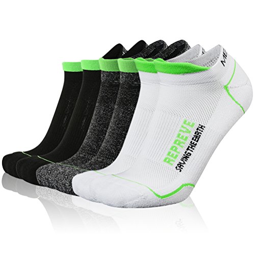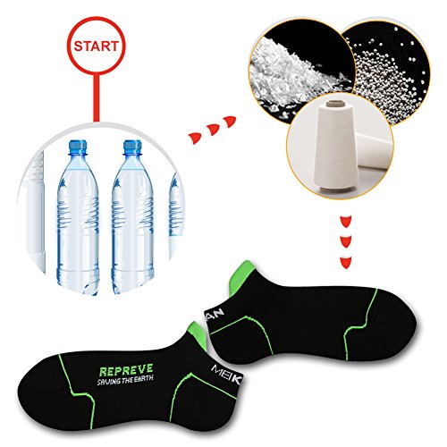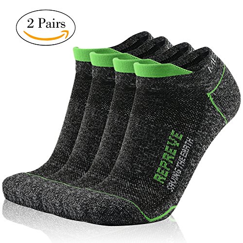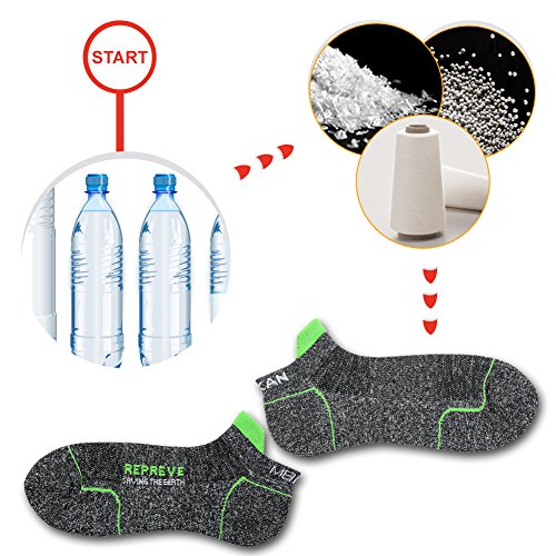 -. Feature : Fit & Design: Half thickness / cushion provides the perfect amount of support while a Y-Heel prevents slippage and keep your feet stay in a right space. / Arch Support: There's even an elastic arch support to further minimize friction and produce a fantastic sense of stability & control in your stride. / Moisture Wicking: Breathable Mesh Ventilation Construction design wicks sweat away, stops the growth of bad bacteria and keeps you feet cool and dry during sports and exercise. / 2 Packs Low Cut Running Socks: Each package includes 2 pairs of running socks with same colors. The basic colors - white, black and grey ensure you will always find the perfect pair to match your running gear, shorts and shoe. / Material & Size: 92.8% REPERVE Recycled Polyester, 5.3% Rubber, 1.9% Spandex; Large fits US Men 7-11, Medium fits US Women 5-9.