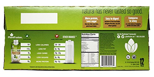 ReleaseDate : 2017-01-01 Studio : Plantfusion Publisher : Plantfusion Binding : Health and Beauty Product Description Less is MORE! Plant Fusion's Ready-to-Drink shake contains less calories, less carbs, less sugar MORE protein than any other plant-based RTD shake on the market. One shake yields 18g of nutrient dense plant-based protein and just 150 calories. Plus 22 vitamins minerals. Similar to Plant Fusion Complete powder, our unique protein blend helps attribute to the unparalleled taste and texture of the RTD. Plant Fusion Ready-to-Drink compares to whey protein as a rich source of amino acids, without the digestive issues because it's free of major allergens like dairy, gluten soy. 0