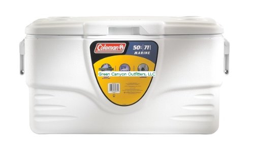 Product Description The Coleman 50-Quart Marine Cooler was specially designed for boating and fishing, sporting a white exterior with UVGuard sun protection to impede yellowing and cracking from prolonged sun exposure. Sturdy and spacious with strong 2-way handles for easy carrying, the 50-Quart Marine Cooler will hold 71 twelve-ounce cans. The hinged lid has four built-in cupholders for convenience. The Marine Cooler is made with environmentally-friendly Thermozone insulation, which features zero-percent ozone-depletion potential. Outside dimensions: 27.6" x 14.7" x 15".