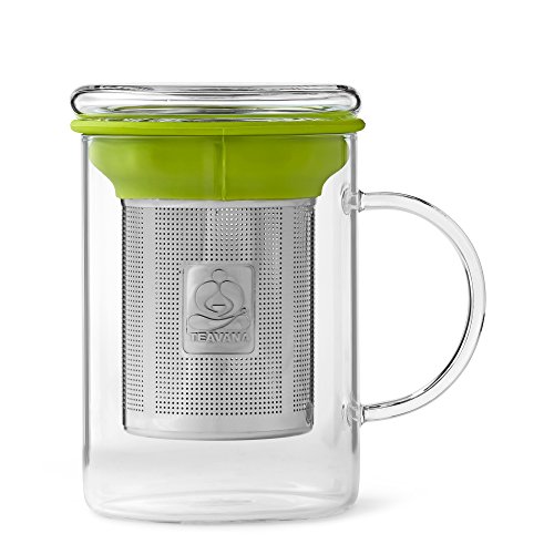 -. Brand : Teavana -. Color : green -. Feature : A Teavana exclusive, this mug houses a stainless steel tea infuser wrapped with a colorful green silicone band which helps to keep the edges cool for easy removal after brewing / This cup is made of borosilicate glass which is stronger and more heat resistant than traditional glassware, while still appearing light and airy / Holds 14oz (414mL) of tea / Dishwasher safe -. Label : Teavana -. Manufacturer : Teavana -. Model : 30417-014 -. MPN : 011057142 -. NumberOfItems : 1 -. PartNumber : 011057142 -. ProductGroup : Kitchen -. ProductTypeName : KITCHEN -. Publisher : Teavana -. Size : 14 ounce -. Studio : Teavana -. Title : Remi Glass Tea Mug with Stainless Steel Infuser by Teavana