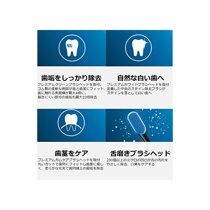 동봉품:다이아몬드 클린 스마트 핸들,프리미엄 클린 브러시 헤드(검정)×1,프리미엄 껌 케어 브러시 헤드(검정)×1,프리미엄 화이트 브러시 헤드(검정)×1,브러시 캡×3,설연마 브러시 헤드(검정)×1,USB충전 트래블 케이스(검정)고, 충전기대(검정)고, 충전기용 글래스,취급 설명서,퀵 스타트 가이드,어플리케이션 다운로드 설명 리플렛
