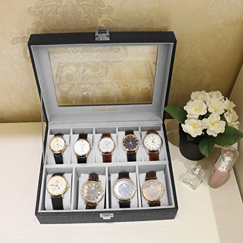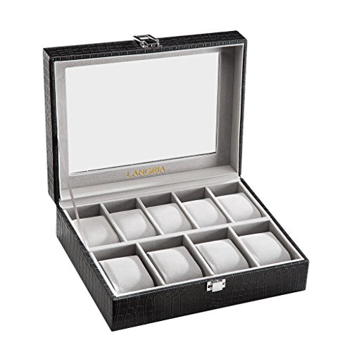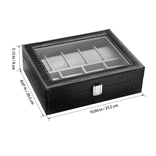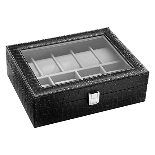 - ELEGANT SHOWCASE: made of sophisticated high-quality black faux crocodile grain leather exterior and super soft grey flocking lining, the watch display case has a metal clasp lock to secure your belongings and a pretty appearance to match your decor