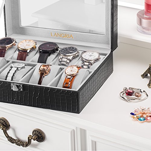 LANGRIA Crocodile Faux Leather Watch Box Display Case Organizer with Soft Flocking Lining Interior and 9 Cushions (4 Large, 5 Standard) for Men and Women, Black/Grey Interior