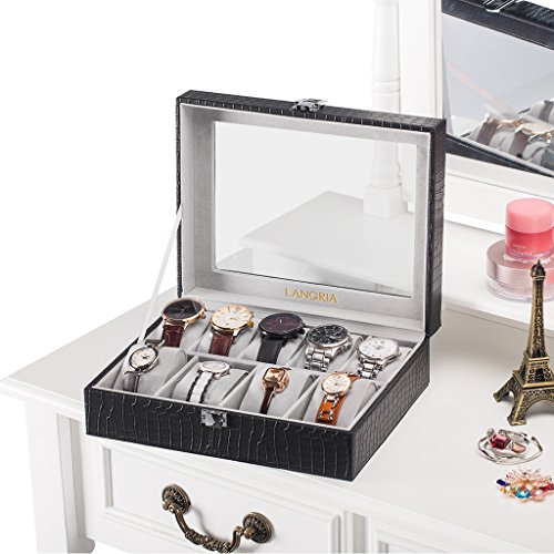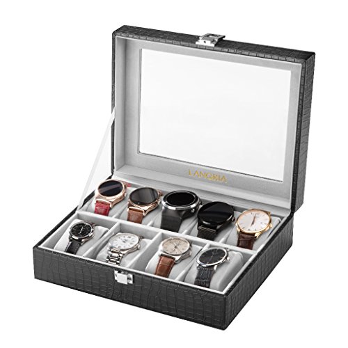 - LARGE GLASS LID: the see-through real glass lid keeps dust away from your belongings and allows you to have a clear view of your displayed watches; in order to prevent the lid from falling when open, it has a strap attached