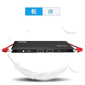 大容量の10000mAhで、iPhone6s に約4回、iPhone7 Plus に3回、Galaxy S6に2.5回、 iPad Mini に1回フル充電が可能です。