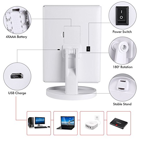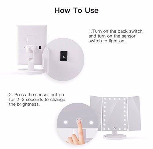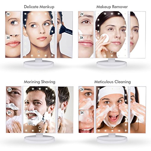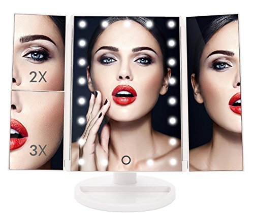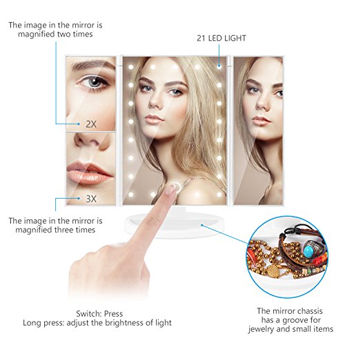 -. Title : TriFold Illuminated Vanity Makeup Mirror, with 21 LED, Touch Screen, 180° Adjustable Stand, 1x/2x/3x Magnification, Batteries and Usb Charging