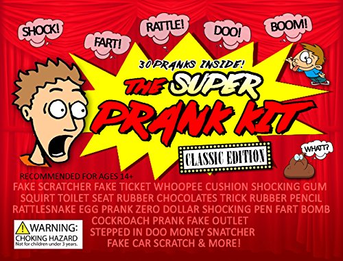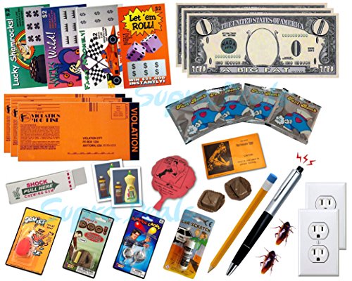 Studio : Supra Deals Publisher : Supra Deals Binding : Toy Product Description Birthday Gifts! Holiday Gifts or Just for Fun! What's inside the box? (3) Fake Parking Tickets; (3) Zero Dollar Bills; (4) Fart Bombs; (4) Fake Lottery Scratchers; (1) Rattlesnake Egg Envelopes; (1) Shocking Gums; (2) Pride Joy Wallet Pictures; (1) Whoopee Cushions; (1) Rubber Chocolates; (1) Trick Rubber Pencil; (1) Squirt Toilet Seat; (1) Money Snatcher; (1) Stepped In Doo; (1) Jumping Candy (1) Car Scratch Decals; (1) Electric Outlet Decals; (1) Shocking Pen; (2) Fake Cockroach! 0